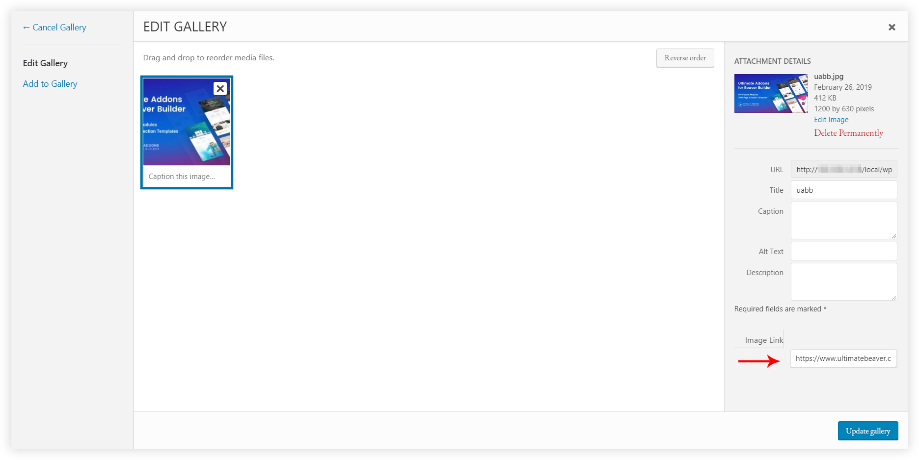 Open your media library. Click on the image, and enter the link you wish to add as the image link.