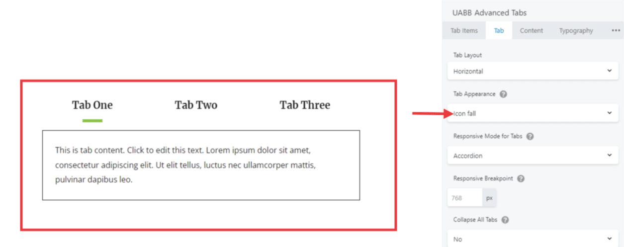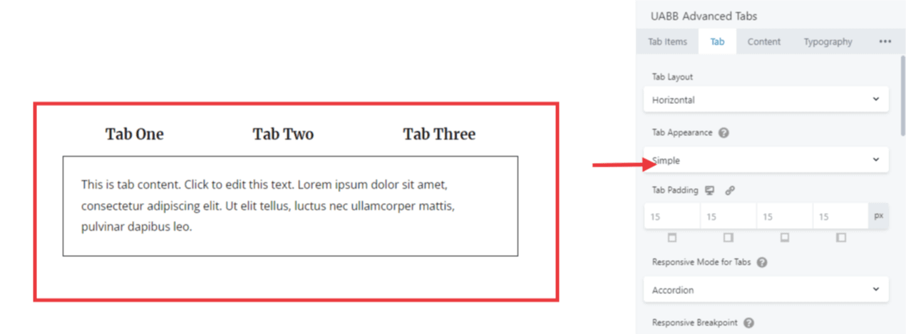 Step 6: If you want to change the typography of the Tabs and Content, you can modify it from the respective Tab/Content and further from the Typography tab.