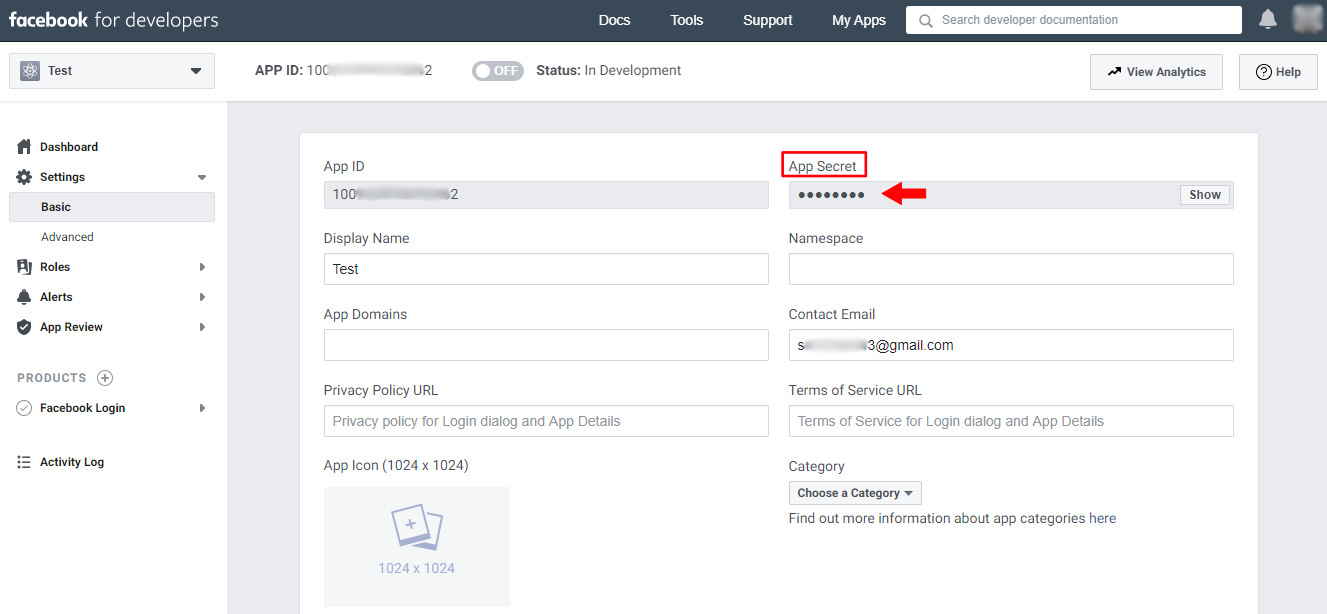 Click on the Show option on the same field and you will be asked to log in to see the App Secret Key.