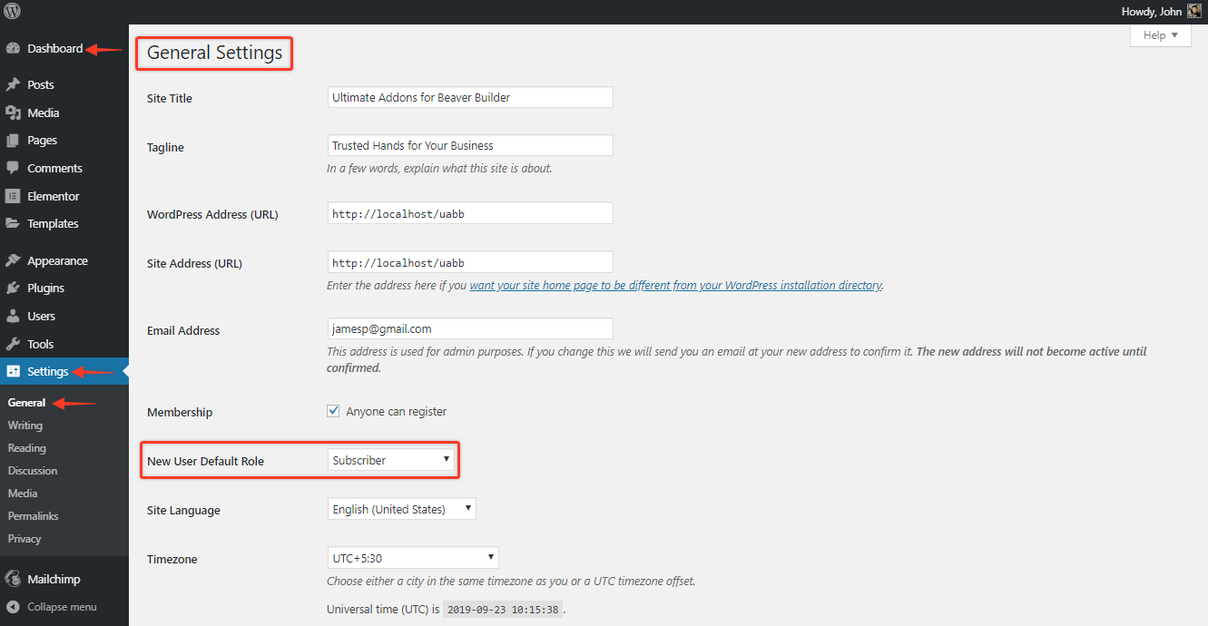 Also, below the same option you need to set the New User Default Role, this role will be set for the new user when he/she registers on your website.