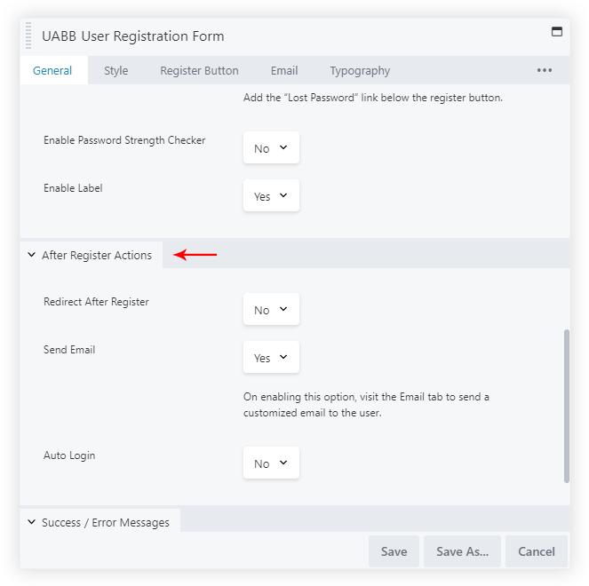 Redirect After Register: Using this option you can redirect the user after successful registration to a Thank You page or a login page. You can paste the required Page URL in the URL field under this option.