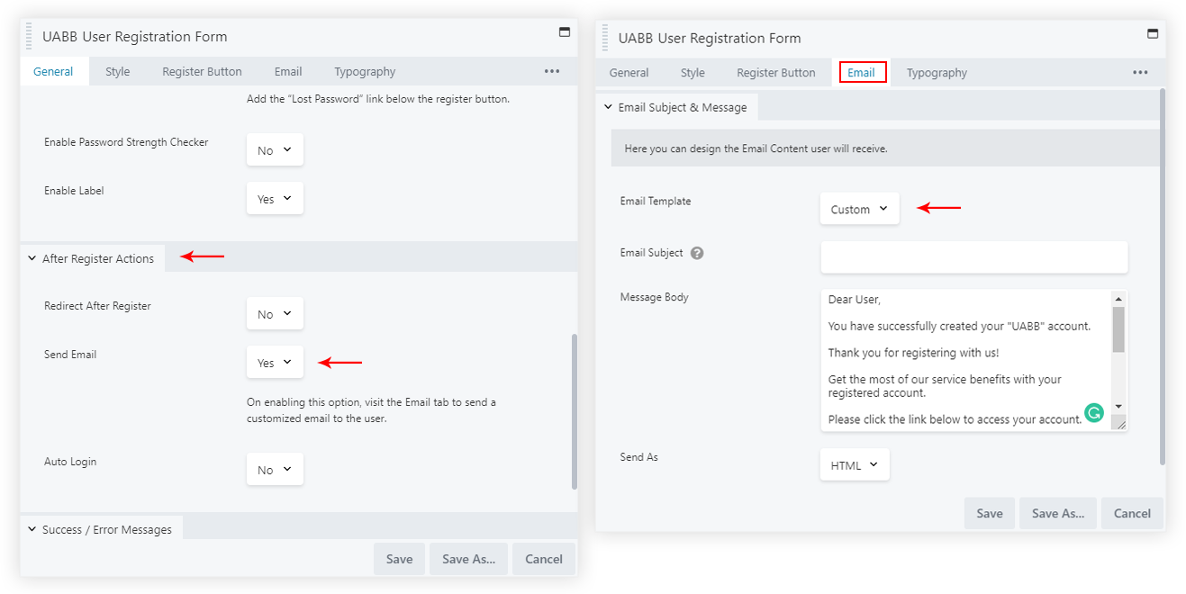Send Email: This option will send an email to the User with a message that he/she has been successfully registered to your website. You can customize the email content under the Email section.