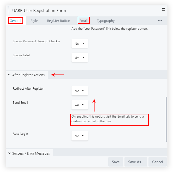 Now, under the After Register Actions section under the General tab, enable the Send Email option, this would – send the new user an email about their successful account creation.