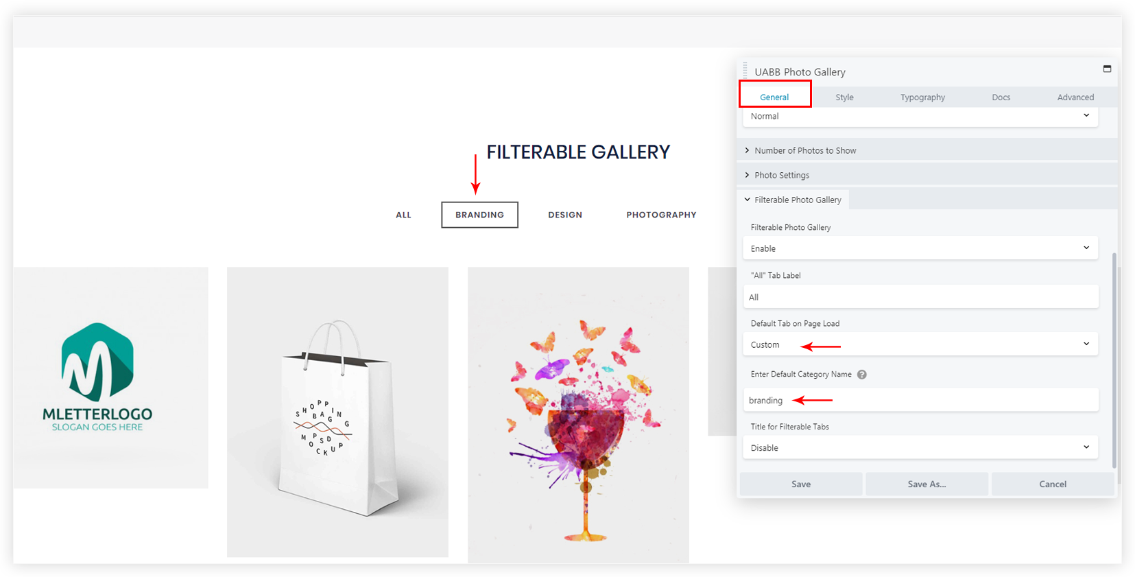 - Consider some of the images are assigned a category Design. You wish to display the Design category tab active on page load.