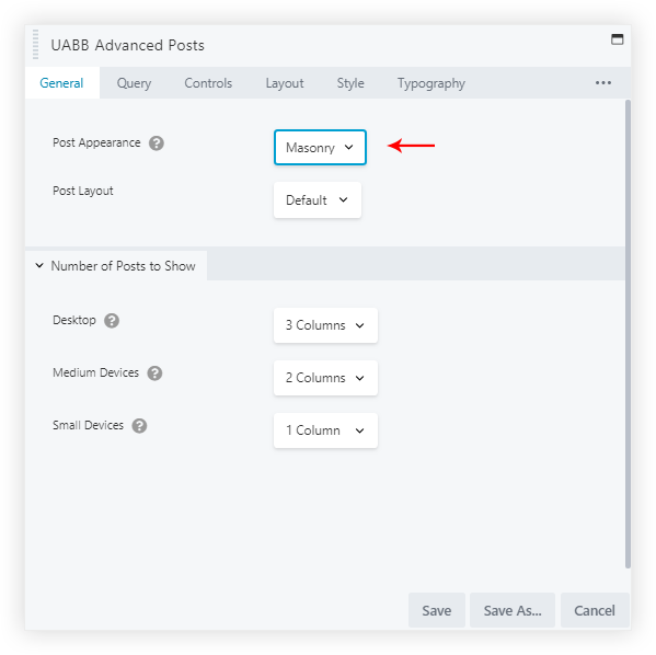 Many users want to showcase their portfolio or blog posts with filters. These can be filtered by category, tags or custom taxonomy. Advanced posts module allows you to use taxonomy filter when post appearance is selected as masonry. List of taxonomies appears depending on selected custom post type. Please note, if taxonomies are not registered for custom post type, filter section will not appear.