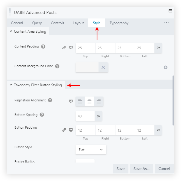 3. Now you can style filter by navigating to Style tab. If you have selected drop-down layout, you can apply typography to elements by navigating to the Typography tab.