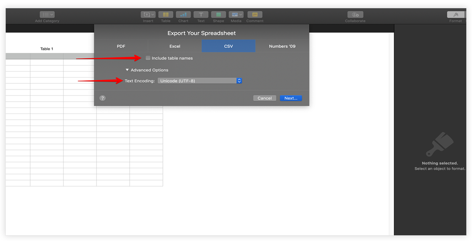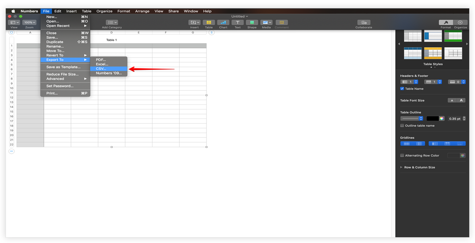 Step 1 – Open a file with Numbers and click on File -> Export To -> CSV