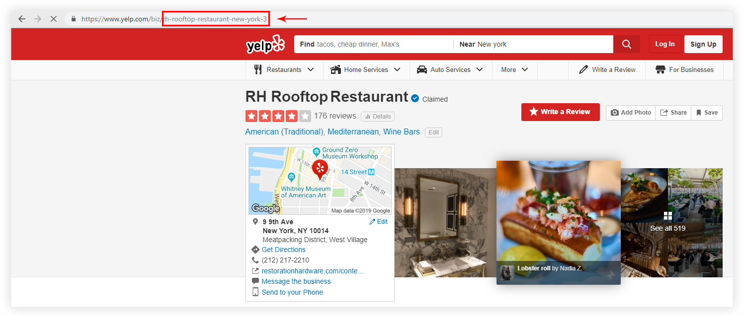 - For example, the Business ID in the following URL is “rh-rooftop-restaurant-new-york-3“: https://www.yelp.com/biz/rh-rooftop-restaurant-new-york-3