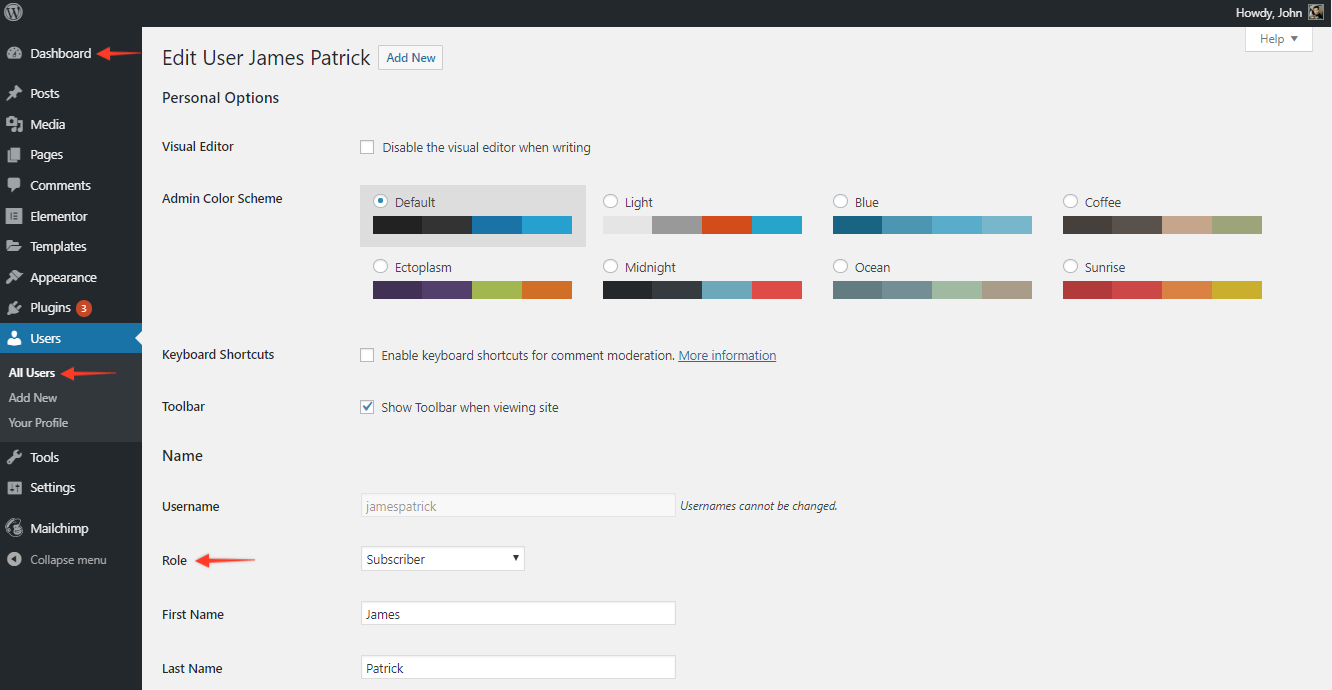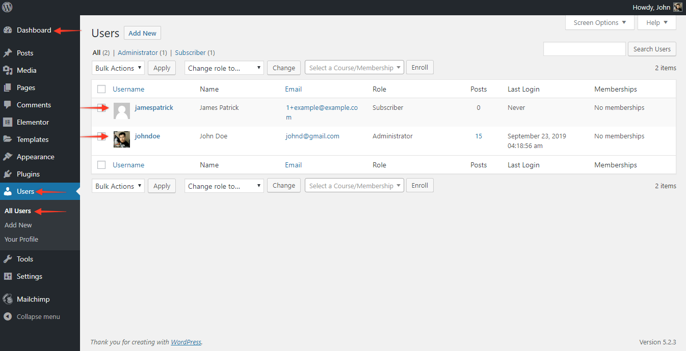 After the Users are registered successfully on your website, and you would like to update the User Role for few users. To do so you will need to visit the WordPress Dashboard > Users > All Users