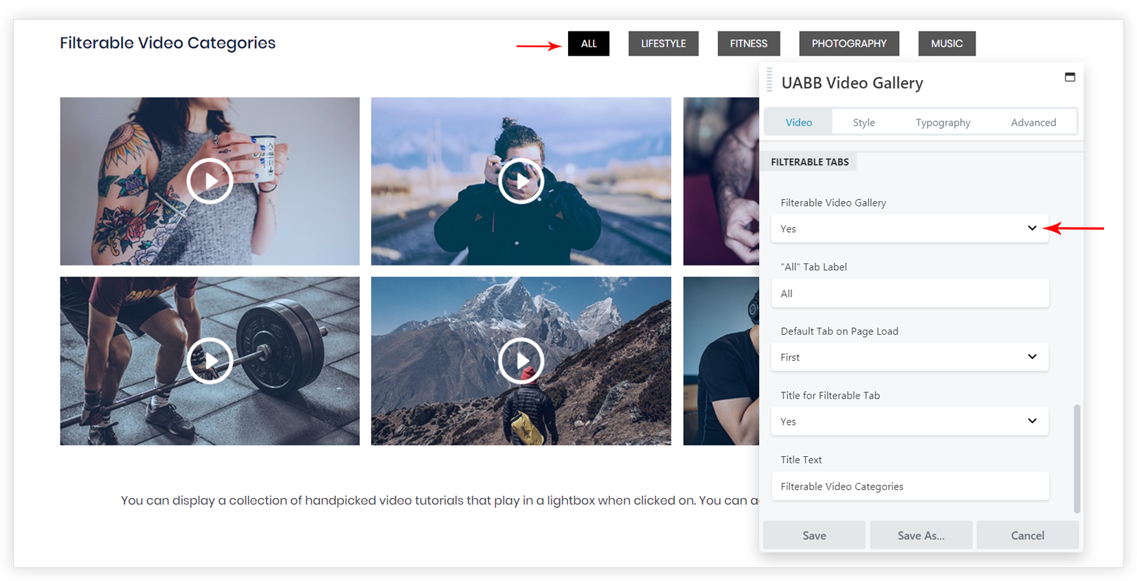 - The category names that are set to videos will display as Filterable Tabs title.