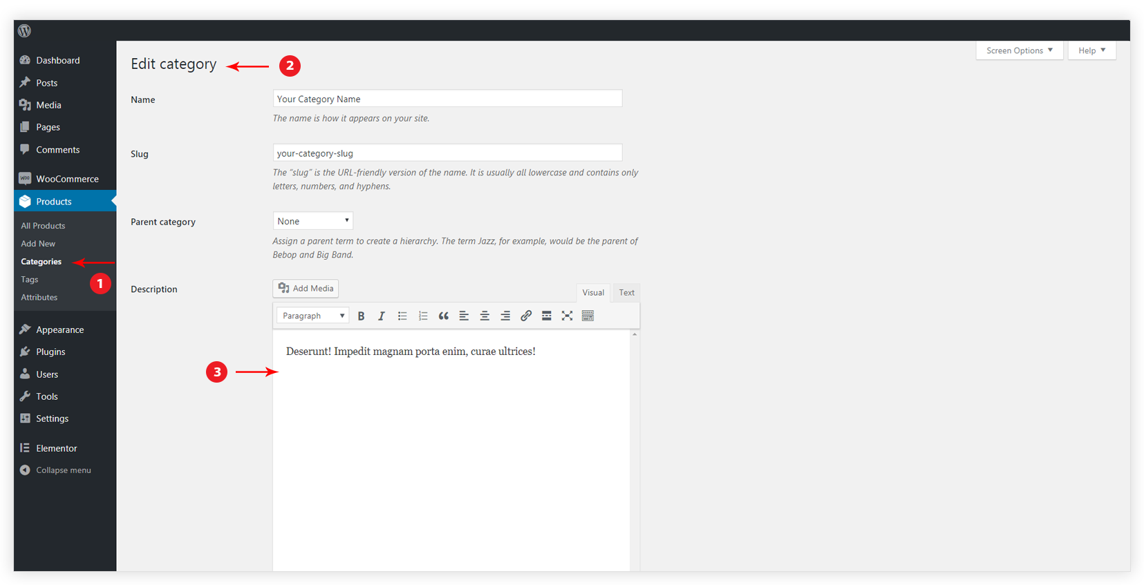 Option 2. From WordPress backend navigate to Products > Categories. Edit the already created category and add a description to it.