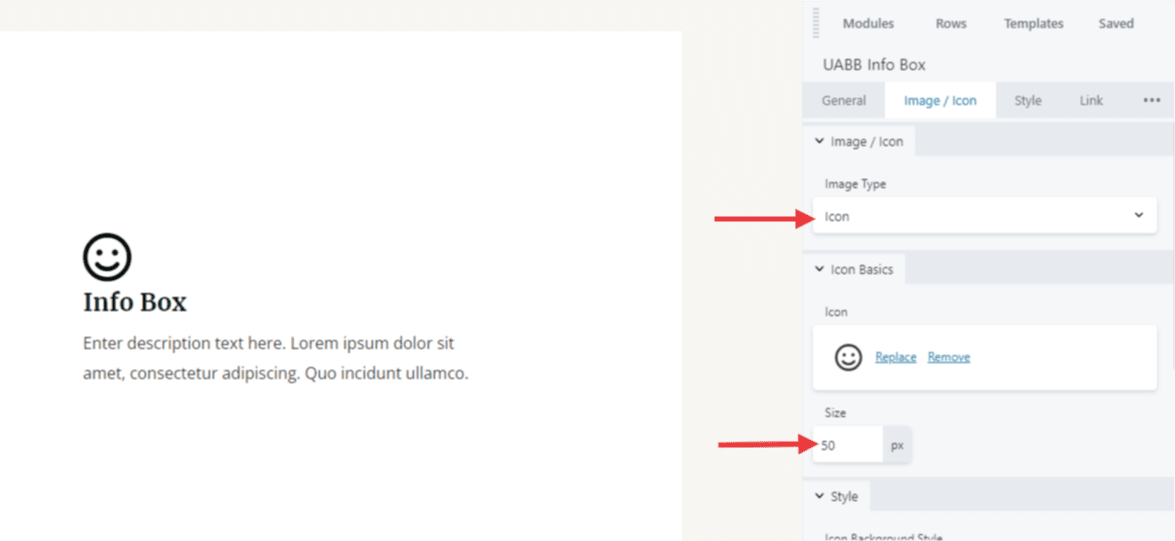 There are separate sections for the Info Box where you can insert the content and manage the Icon/Image position.