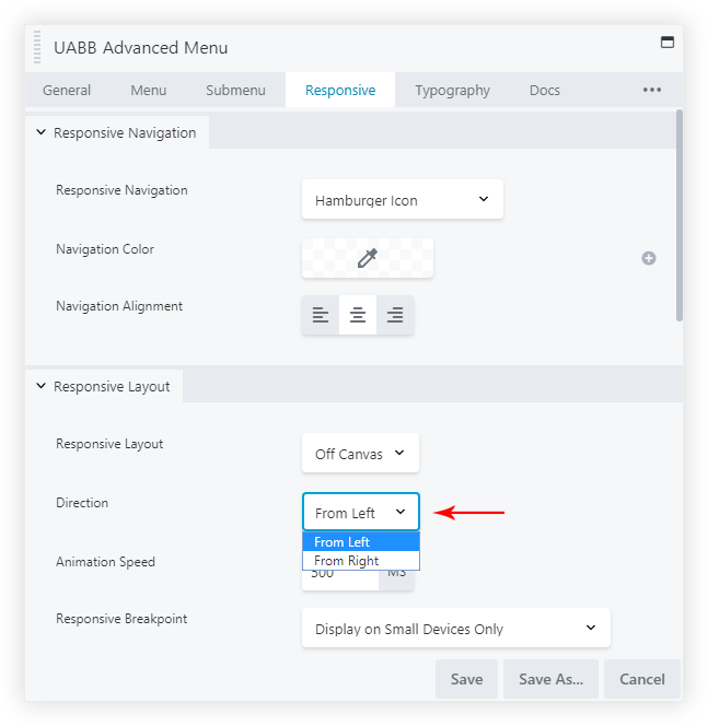 Select a Direction in which you wish to show the Off Canvas Menu.