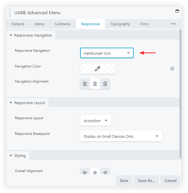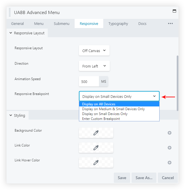Select Responsive Layout > Off Canvas in the Responsive Tab.