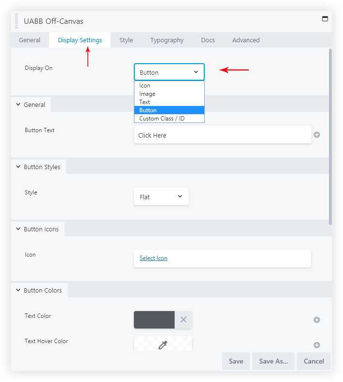 Display settings will allow you to choose a trigger for canvas. You can display it on the click of a text, icon, button or any other element (with CSS class/ID).