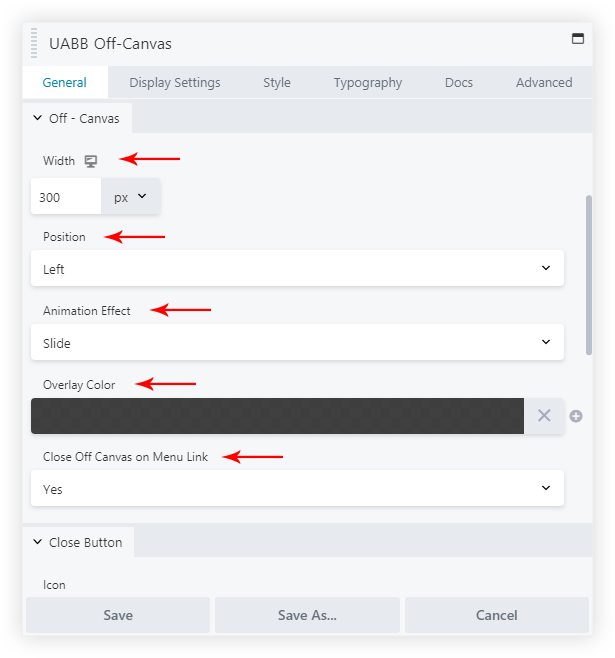 You can customize the button that will close your canvas. You can set the Close Icon, select its Size, Icon Color, Icon Background Color, position and related style of the close button.