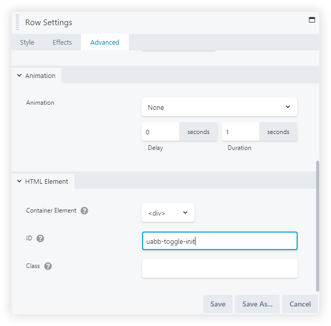 Step 1: Add an ID uabb-toggle-init to the parent row of Content Toggle. Note that add ID uabb-toggle-init only. Other ID will not work.