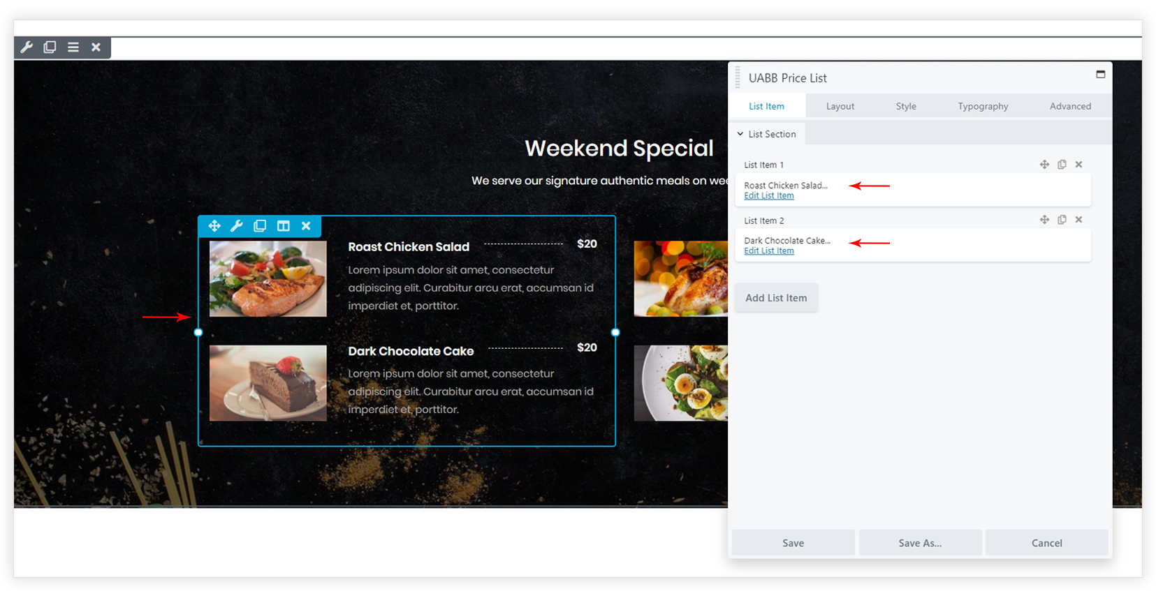 Module allows adding all required details for each list item. Under List Item > List Section you will find options to create all list items. You can even add normal and discounted price foe the items under sale.