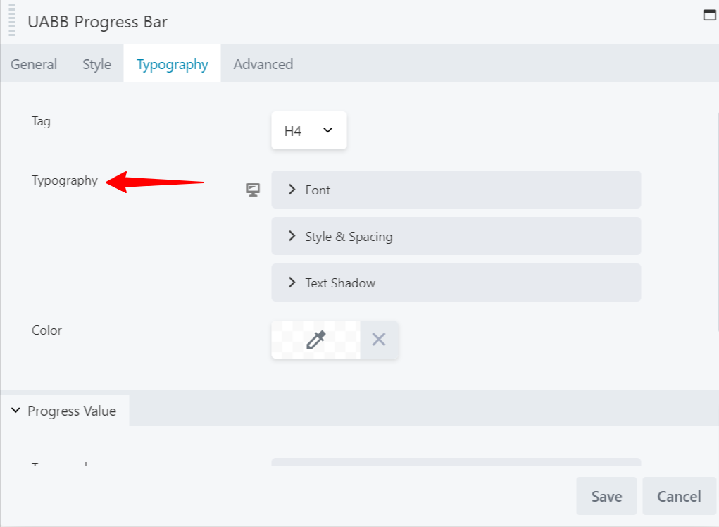The Typography tab focuses on the text elements within the Progress Bar. You can modify the font, size, and other text-related features to enhance the module’s overall look.