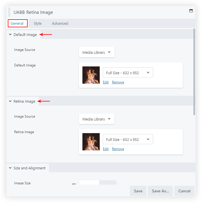 Below the Retina Image section, you will see other sections like Size and Alignment, Caption and Link under which you will be able to set the Image Size, Alignment, Caption, and Link.