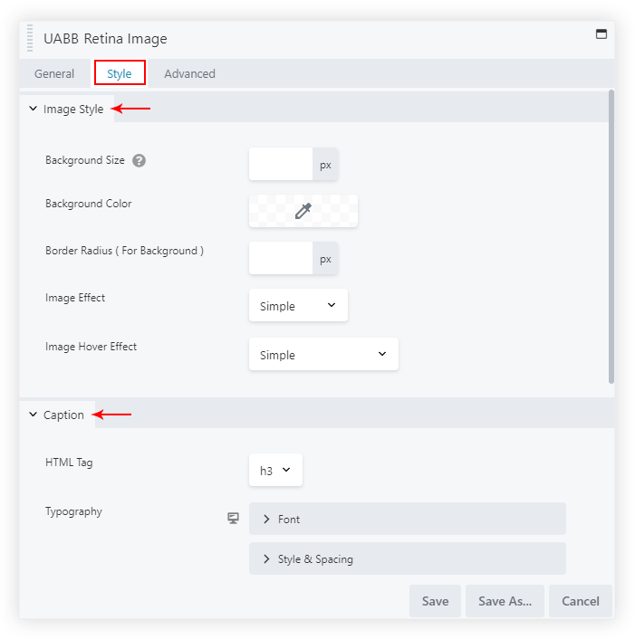 The Image Style section will allow you to set the Background Size, Color, Border Radius, Image Effect.