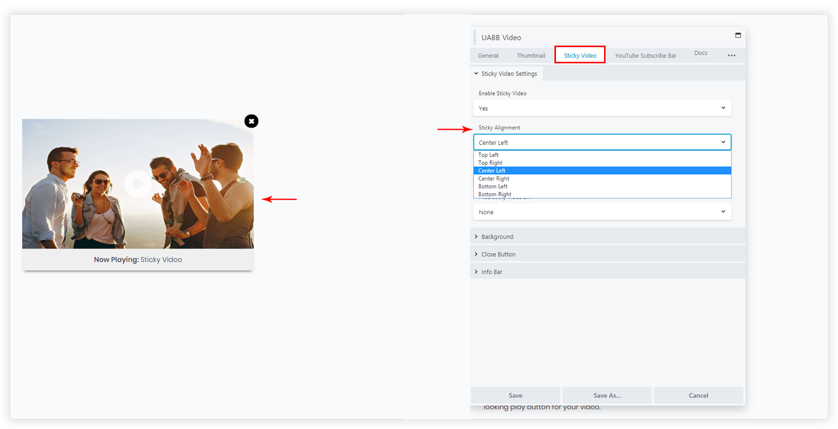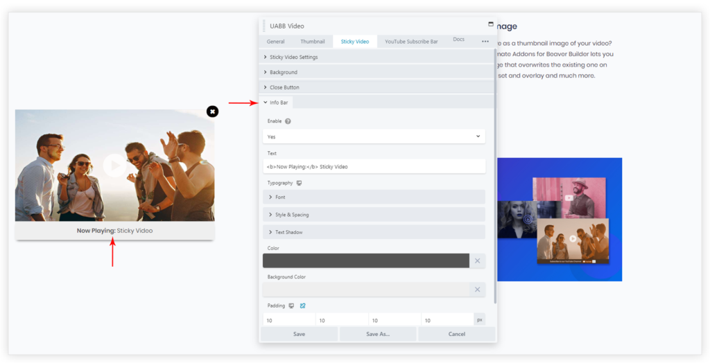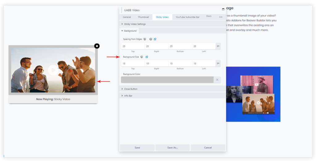 UABB’s Sticky Video feature allows sticking the video on page scroll. Your video will float along the left or right side of the browser window. So, as the reader scrolls the content both the video and your marketing messages will stay in focus.