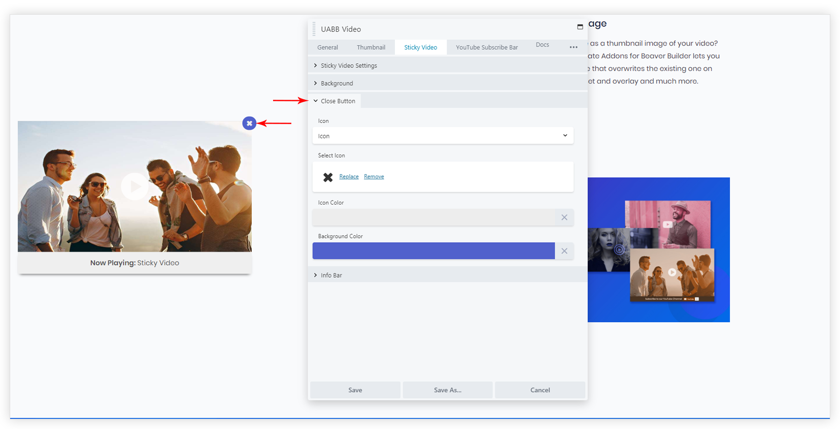You can Enable/Disable the close button for the sticky video. Controls to manage the style of the close button are available.