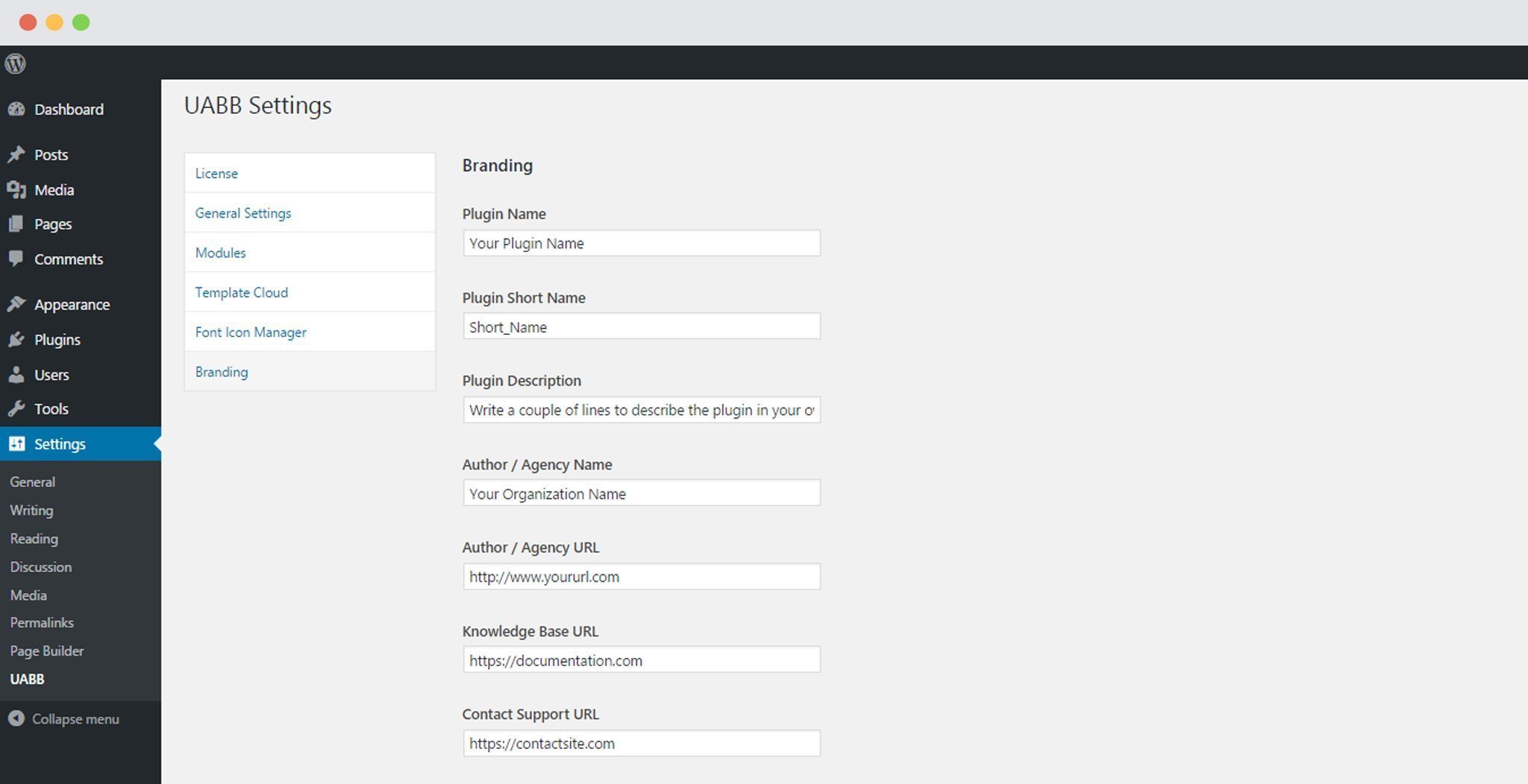 In order to enable the UABB white label option, you will need to click on “UABB” under Settings, open Branding and add all necessary details in the fields given.