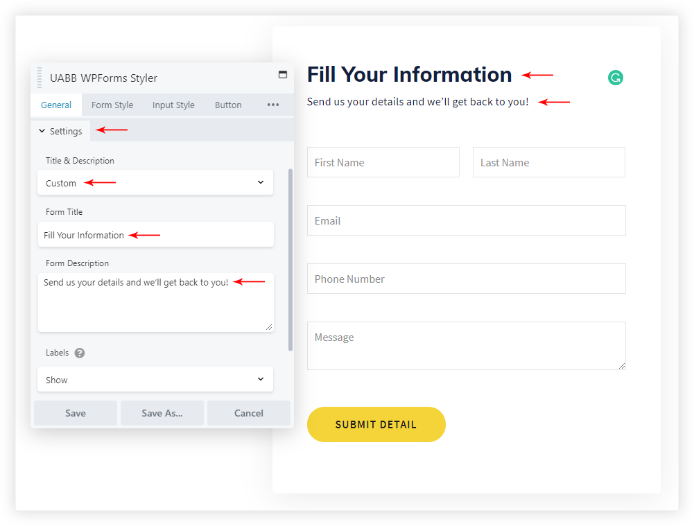 With the WPForms Styler module, just drag and drop the module, select the WPForms from the list and style it with the UABB module options.