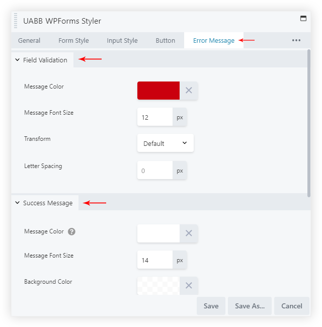 Success / Error Message options allow setting colors for Error Field Message and Form Success Validation. This option allows setting different Message and Background colors for the fields that have an error.