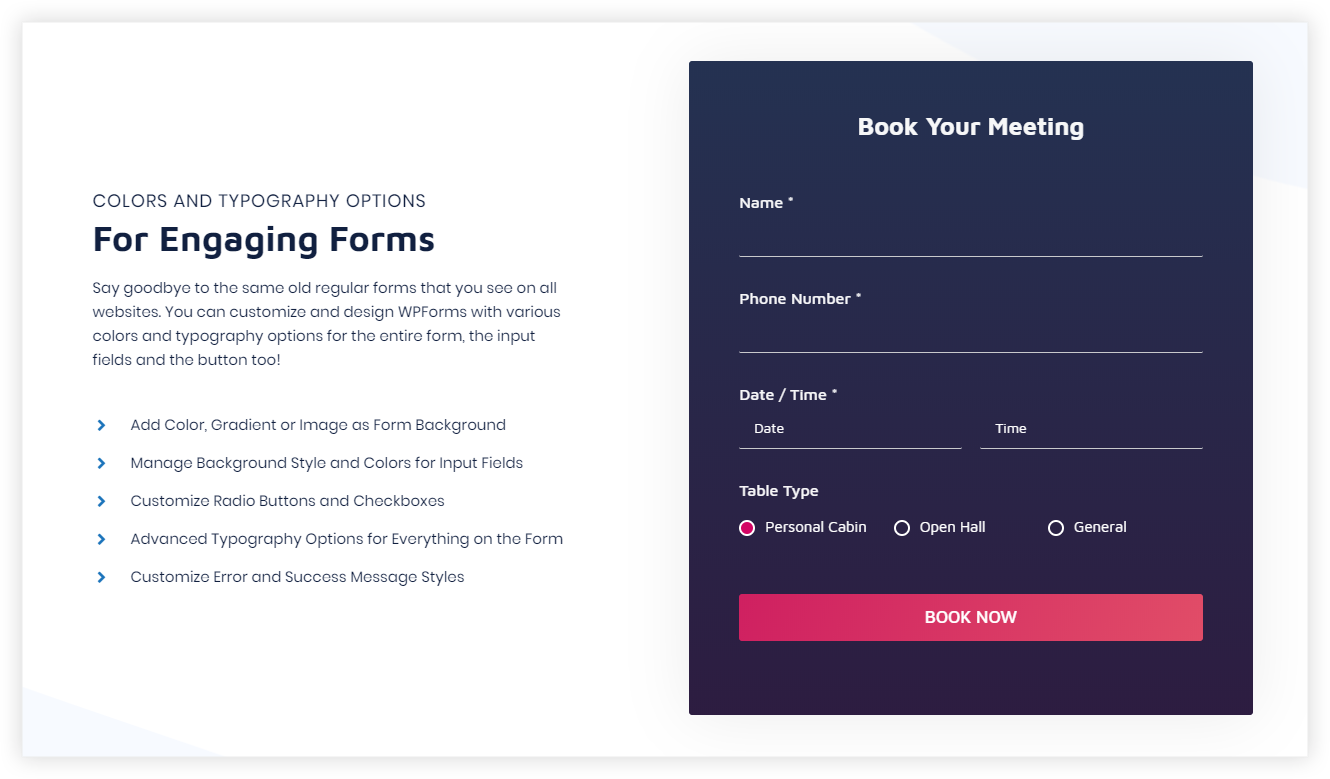 This module will allow you to design WP Forms to suit your website’s color scheme and much more. It will help you to customize a form with different color and style settings. Below are the key features for the module –